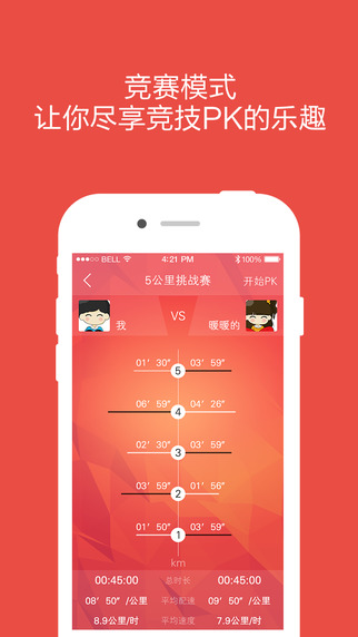 监测运动步数、距离、卡路里燃烧、以及GPS路线、速度和配速;跑步历史数据云端存储,你所有的最佳成绩随时呈现展现给好友,个人最佳成绩记录,不断挑战自己,快速成长,竞赛PK,挑战自己只是开始,挑战高手才能成为高手。