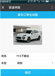 豪车配单生成器是一款十分强大好玩的将自己名字生成在豪车选配单上的软件。在豪车配单生成器中现在包括保时捷卡宴、法拉利兰博基尼、奔驰豪车选配单可以生成,微信上那些晒自己豪车配单的就是用这款软件做的哦!