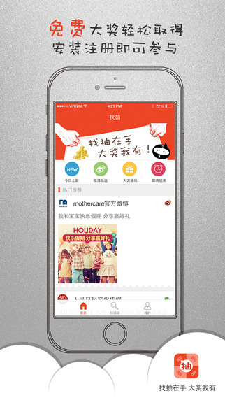 微博,微信中每天有多少抽奖活动?令人眼馋的奖品每天就在你手边溜走!网络上每天有多少免费赠送奖品的活动就等你来参加?甚至是直接送现金花费!使用找抽,奖品尽入囊中不是梦想!