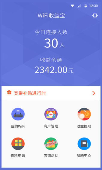 wifi收益宝app是由平安WiFi推出的全新WiFi经营收益管理平台。WiFi所有者通过WiFi收益宝,把自有WiFi热点接入到平安WiFi的网络之中,就可以根据用户在该热点产生的累计上网时长等因素,获得由平安WiFi提供的收益。