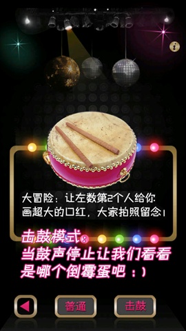 提供三种游戏方式:自由模式(摇晃手机即可出现题目,适合轮流游戏,每个人都有机会)、随机模式(通过拍照记录每个玩家的头像,游戏开始后会随机抽取那个倒霉的玩家来做题)、击鼓传花模式(使用传统的击鼓传花方式游戏,游戏会模拟逼真的击鼓声,并随机在一刻停止,然后看看传递的那个东西留在哪个倒霉蛋手中呢:))