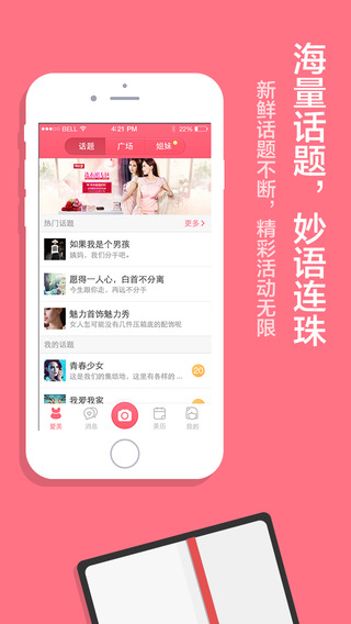 姐妹聊不停,天天新话题。吃美食、聊酸甜苦辣、情人节、母婴、婆媳、幸福瞬间,创造你的话题,美荔聊无限。私聊,群聊,语音聊,图文并茂,美荔让心心相惜的姐妹没有距离!