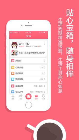 谁说不来大姨妈就不需要经期助手?高压痘、经前痛、忙碌肥、情绪瘦、熬夜熊猫眼、失眠掉头发,孕前准备、孕后休养、哪一个不是姐妹的生活之重。美荔的大姨妈经期工具帮你追踪身体健康、生理周期,准确判断生理健康和预测大姨妈。更有贴心的记账和日记小工具方便你的生活!