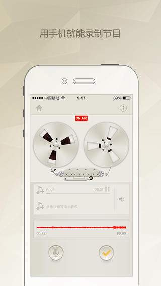 可录制长达60分钟节目,可添加多首音乐随时切换播放,自动混音、降噪,无需再进行后期剪辑。