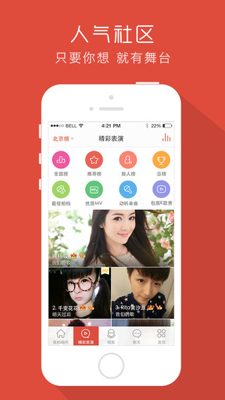 - 全国榜、地区榜、附近歌王、单曲排行、合唱排行,这里的舞台足够大