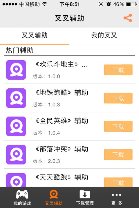 2.在“我的游戏”页面中点击“欢乐斗地主”右侧的“下载辅助”即可;或者在“叉叉辅助”—“热门辅助”中点击“欢乐斗地主辅助”,进入“辅助详情”页面后点“下载”。