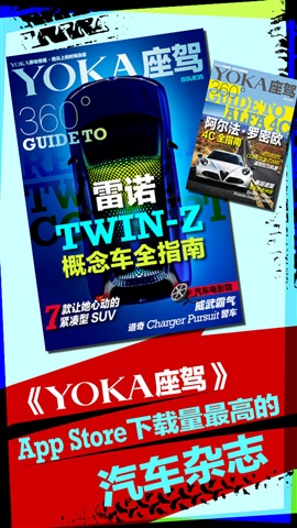 《YOKA座驾》是基于iPhone/iPad等高端移动平台的车迷杂志,他满足你的视觉,突破你的想象,挑战你的神经。他坚持自我的态度,乐于把汽车与生活交织一起,他与你共同分享爱车驾驭体验,为你搜罗最稀罕独特的好车资讯,为你驾驭趣致人生提供最需要信息。