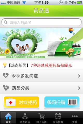 针对老百姓日常生活中在找药、查药、买药、辨药、服药等一系列需求提供一站式服务。做最专业的便民医药应用,历趣分享的本软件主要功能包括:药品查询、对症找药、条码扫描辨真假、同类药品对比、用药指南、在线买药及附近药店定位等服务。药品通,让您买药、用药更轻松,是每个中国家庭必备的健康应用。