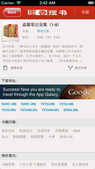 图书齐全、书籍更新快、界面美观大方、操作简单等优点使得墨香搜书深受广大阅读爱好者的好评,各平台上的累计下载量已超过百万。没有太多的宣传,仅仅凭借阅读爱好者的口口相传,我们获得了不俗的成绩,这是我们的幸运。