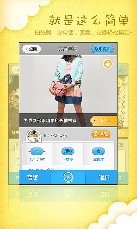 小交易,“会说话”的好友邻里买卖交换服务。 就是这么简单,拍张照,说句话,买卖、交换分分钟轻松搞定~ 这里有朋友自己的闲置,有邻里的亲口描述,靠谱无需犹豫~ 你求,我有,小交易一下,TA就是你的了~ 陌生人交易保障计划让交易刚放心~ 快捷发布、迅速变现、真实内容,最棒的好友邻里买卖交换服务~