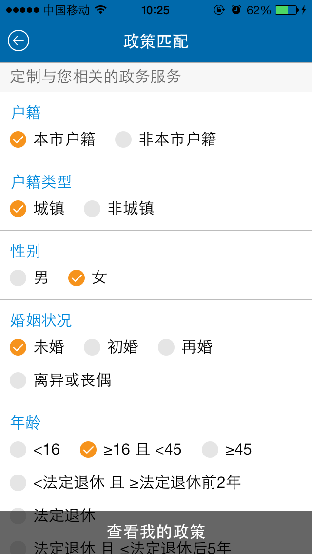 下载注册用户后,在设置页面输入你的个人概况,系统将马上为您寻找到适合于您个人情况的政策、法律等,比如您每月应缴纳多少个人所得税?多少养老金和公积金?失业以后怎样最大化地利用失业金的政策?现在买房会不会被限购等等,方便快捷,且流量消耗极低。