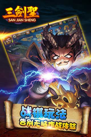 《三剑圣》是一款3D卡牌战棋策略手游。 游戏使用卡通渲染的武将模型与3D动作捕捉技术相结合,遵循原著,加入恶搞爆笑剧情;同时,玩法上有别于传统的战棋游戏,以极致的智能操作及运筹帷幄的策略战术,并以3D滑动旋转的视角控制开启了立体式全息战棋策略时代。