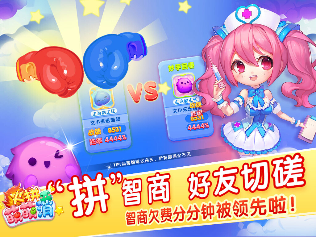 聪明才是最新的性感标准。还在跟好友争论谁更性感?那就快来火拼萌萌消比一比。特有的好友约战模式,让你能随时随地战一局,分分钟评出智商帝。独孤求败很久了的玩家还可以参加世界神医大赛,与来自世界的高手们切磋切磋,看看谁能登鼎绝世神医的宝座?