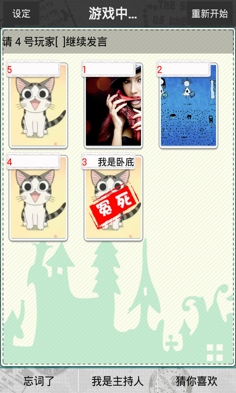 4、投票并设定玩家出局。大家依次发言之后,开始投票怀疑的卧底对象。获得票数最多的玩家出局(持有游戏的玩家点击该玩家的头像即可设定出局)。
