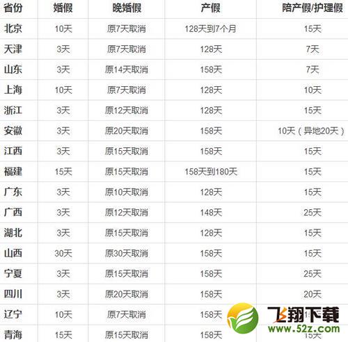 省份婚假晚婚假产假陪产假/护理假