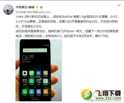 另在外观方面,该网友表示“外观类似小米5”,亮点是“高屏占比”。她透露,小米2se机身几乎与5se一样大。至于发布时间和价格,小米新机或于今年6月发布、售价1799元。