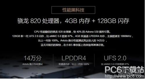 小米5搭载骁龙 820处理器 / 4GB内存 + 128GB 闪存 / 4 轴防抖相机 / 3D 陶瓷机身 ,同时采用1080P高分辨率的5.15寸屏,支持快充和NFC。