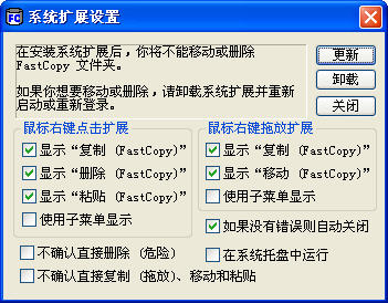 第二种,注册右键菜单。点菜单“设置--->右键扩展”弹出“右键扩展”对话框,然后点 [安装] 按钮即可注册右键菜单。你可以直接在任意文件或文件夹上面点右键弹出菜单,然后选“复制(Fastcopy)”、“删除(Fastcopy)”、“移动(Fastcopy)”等命令,即可开始复制、删除或移动文件或文件夹
