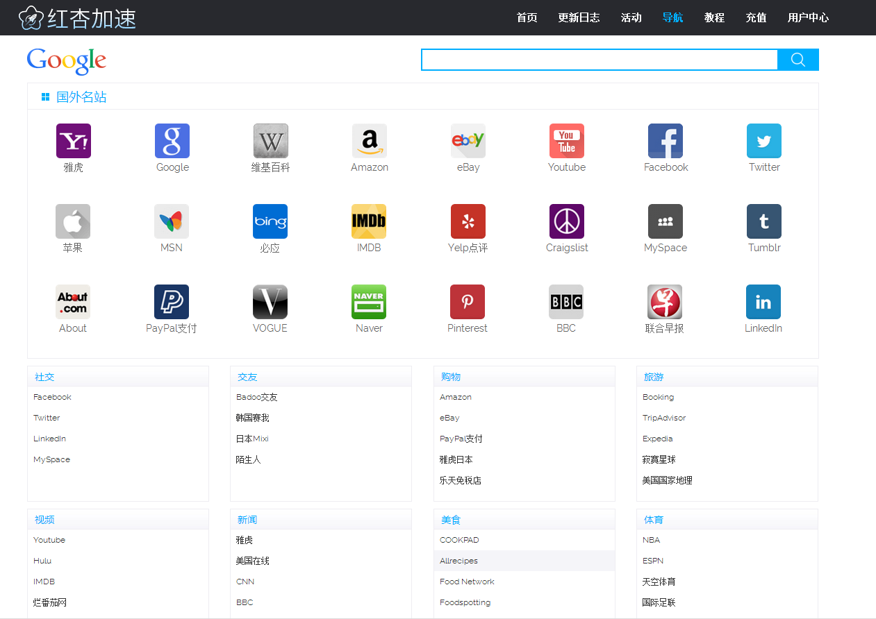 成功登录,点击连接,即可跳转到海外网站导航,您可以随心所欲的浏览网站。注意:一个账号里的流量在各个端口都是通用的。