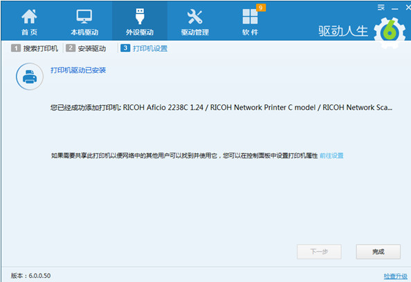 第二步,安装驱动。安装打印机驱动无需再去官网下载驱动,驱动人生一站式搞定。搜索到打印机之后,驱动人生会自动搜索与该打印机匹配的打印机驱动,直接进行安装。打印机程序安装完成之后,继续点击下一步。