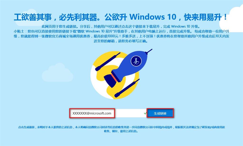 1. 点击链接,进入易升网页 http://cnupgrade.microsoft.com/?channelid=2 ;在空白处,填写您的准确邮箱地址;