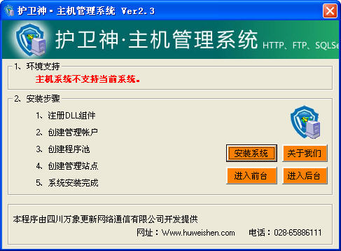 护卫神.主机管理系统 是一套为方便广大用户管理服务器而开发的软件,支持开设主机、SQL Server2000/2005、MySQL。
