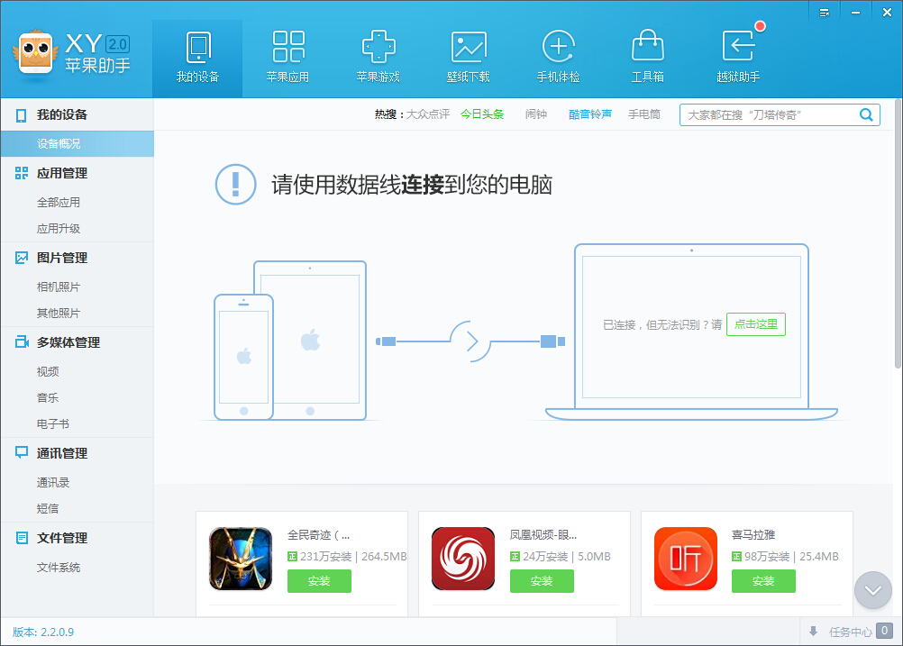 xy助手是一款苹果IOS设备的第三方管理工具,同时支持iPhone 、iPad、iTouch等。为广大果粉提海量软件、游戏等资源下载安装。