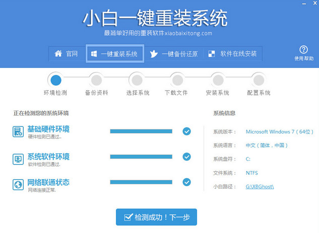 第二步、软件自动检测电脑软硬件环境以及电脑网络连通状态,完成后点击下一步按钮