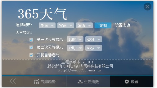 365桌面天气能够自动测出你所在的城市,并会在主界面显示此刻的温度、天气状况、空气指数、风速、日期、今明后三天天气状况,是一款小巧的桌面天气工具。