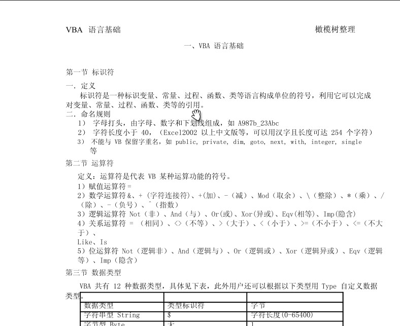 很不错的VBA学习教程,我也是刚刚从网上下的,免费送给大家了!Visual Basic for Applications(VBA)是一种Visual Basic的一种宏语言,主要能用来扩展Windows的应用程式功能,特别是Microsoft Office软件。也可说是一种应用程式视觉化的Basic Script。1994年发行的Excel 5.0版本中,即具备了VBA的宏功能。