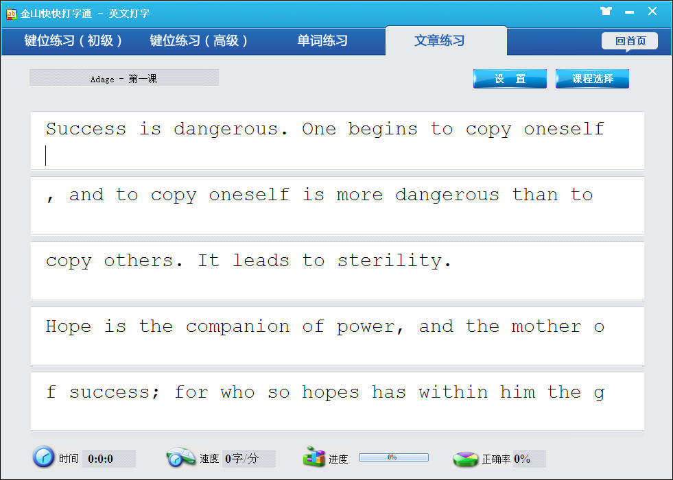 针对用户水平的定制个性化的练习课程,每种输入法均从易到难提供单词(音节、字根)、词汇以及文章循序渐进练习,并且辅以打字游戏寓教于乐不枯燥。是学打字的最佳伴侣,电脑入门的好伙伴! 金山打字通是专门为上网初学者开发的一款软件。