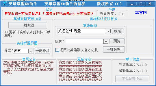 英雄联盟Xk助手是一款专门针对于游戏LOL开发的一款辅助软件。该软件支持英雄默认皮肤修改,游戏更新加速的功能。小编亲测,安全可用。欢迎需要的朋友下载使用。