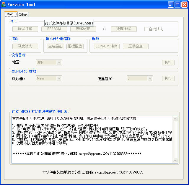 先关闭打印机电源,给打印机装3张A4复印纸,然后准备让打印机进入维修状态:1、先按住 停止/重置 键,然后按 <电源>键 开机(别松开)。2、按 <电源>键 不放手的同时,松开 <停止/重置> 键(此时电源键还是按住不放的状态)。3、然后在按5下 <停止/重置> 键,按最后一下的時候按住不放。(此时<电源>键与<停止/重置>键都处于按住不放的状态)。4、同时松开 <电源>键和<停止/重置>键键,等打印机启动运行完毕后,打印机会显示为”0″,即进入打印机维修模式。5、电脑提示找到新硬件并提示安装驱动,不用管它,如果没有找到新硬件,建议重启电脑或更换电脑试试。(如果电脑找不到新硬件,清零软件是无法使用的)使用佳能mp288清零软件中文版进行清零。