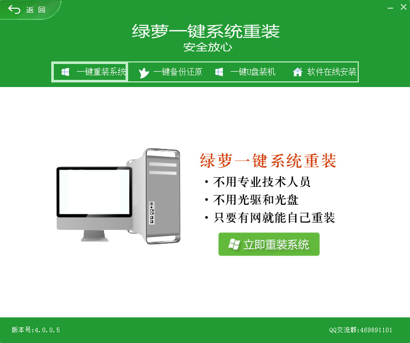 绿萝一键重装系统是一款简单易用的系统重装工具,绿萝一键重装系统操作非常简单非常简单非常简单一键就能快速重Windows10操作系统,有了该软件就算你对电脑一窍不通也能自己重装系统,而且绿萝一键重装系统还支持U盘拷贝重装功能,能满足多大电脑重装的需求