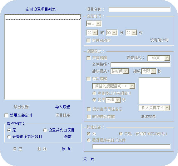 ★定时设置支持无限多个任务项目。任务周期多种多样:按公历有每日、每周、每月、每年、具体年月日,按农历有:每月、每年、某属相年某月某日,也可以设定某节日、某节气作为周期。任务类型有:提醒、关机、运行程序和打开文件。其中提醒方式有声音(支持mp3、mid和wav)、窗口、时钟震动等,定时关机支持Win98/2000/XP/2003等操作系统。