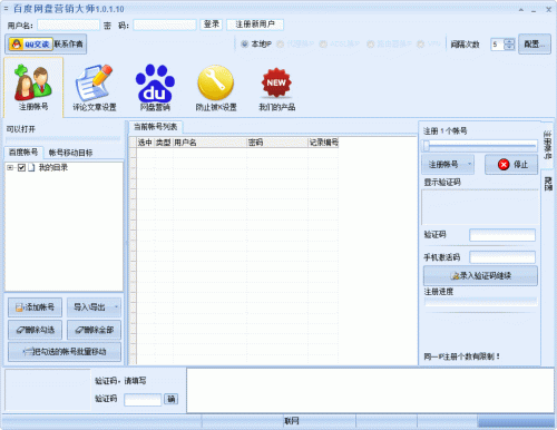 百度网盘营销大师是一款多功能的营销软件,软件基于百度网盘,功能强大集百度帐号注册、帐号激活、批量管理、搜索百度云资源、网盘下载资源、百度网盘留言、评论等多种功能于一身,是一款强力的营销工具。有需要的朋友千万不要错过!