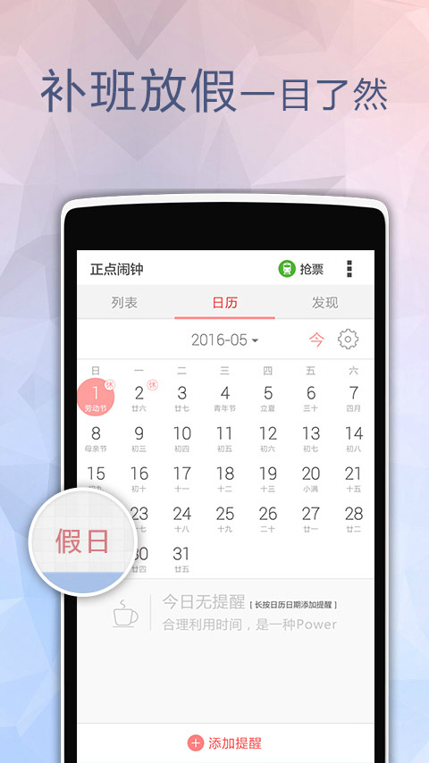 正点闹钟是Android上最强大、最好用的闹钟,是中国人自己的闹钟,完美支持农历,完全符合国人生活习惯,绝非汉化。这也是世界上第一款生活提醒闹钟,在正点的时间做点正事。更有超级灵活的提醒周期,覆盖单次提醒、单双号、隔N天提醒、周提醒、月提醒、季度提醒、年提醒。正点闹钟下载