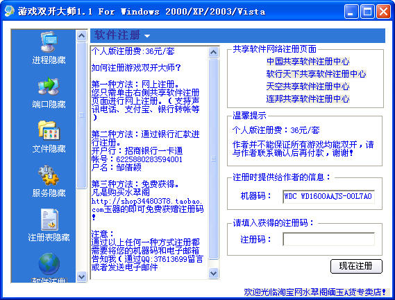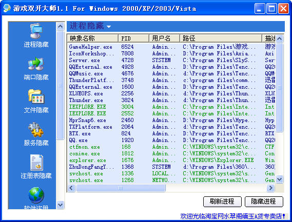 帮助你打开任何网络游戏和外挂的多开限制,同时挂多个号的最好通用工具,并具备进程隐藏,端口隐藏,文件隐藏,服务隐藏,注册表隐藏等强大功能。