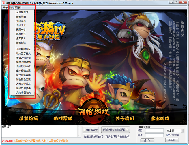 造梦西游4幻米修改器是专门为页游《4399造梦西游4》游戏玩家全新制作的游戏辅助工具,此款辅助能够为玩家提供法宝修改、技能秒杀、普攻秒杀、技能特效等实用功能。玩家通过该辅助能够轻松游戏,该辅助功能强大,绝对是造梦西游4玩家使用辅助的首选,使用该辅助将大大降低玩家的游戏难度,喜欢玩造梦西游4的玩家快来试试这款辅助吧!
