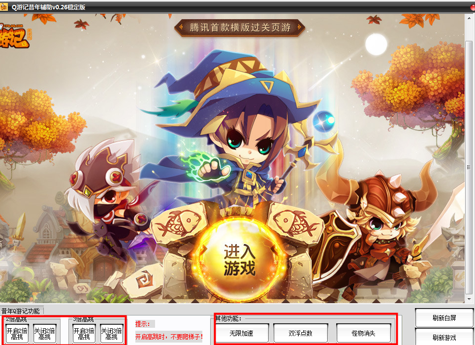Q游记昔年辅助其实就是腾讯开发的《Q游记》游戏的最强辅助工具。不但优化了操作界面,而且还让大家免费获得3倍高挑、无限加速、怪物消失等功能,从而更加愉快的在里面进行玩耍,喜欢的都可以来到这里进行下载!