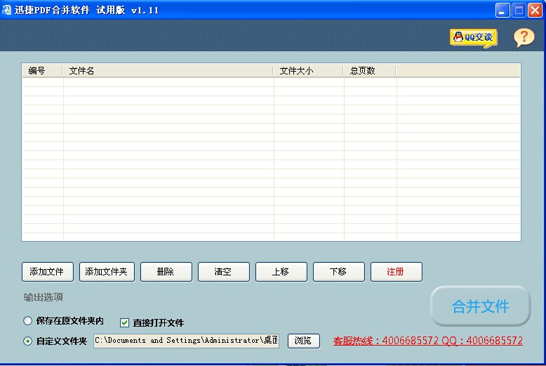 迅捷pdf合并软件是一款专门针对PDF文件批量合并的工具;操作简单,支持选择文件和文件夹;支持文件拖拽,可以通过上移或者下移按钮自由调整pdf文档进行排序,批量合并执行速度快,是办公人员急需的好工具。