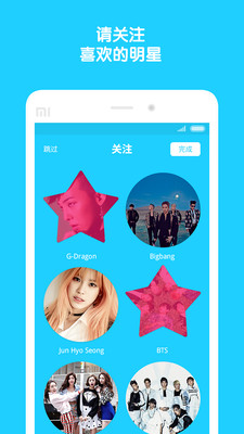 请选择自己喜欢的明星并进行关注吧。假如在V中关注的明星有直播节目的话, 您会提前收到提醒。关注的明星越多,视频欣赏得越多,即可提高您与明星的亲密指数。