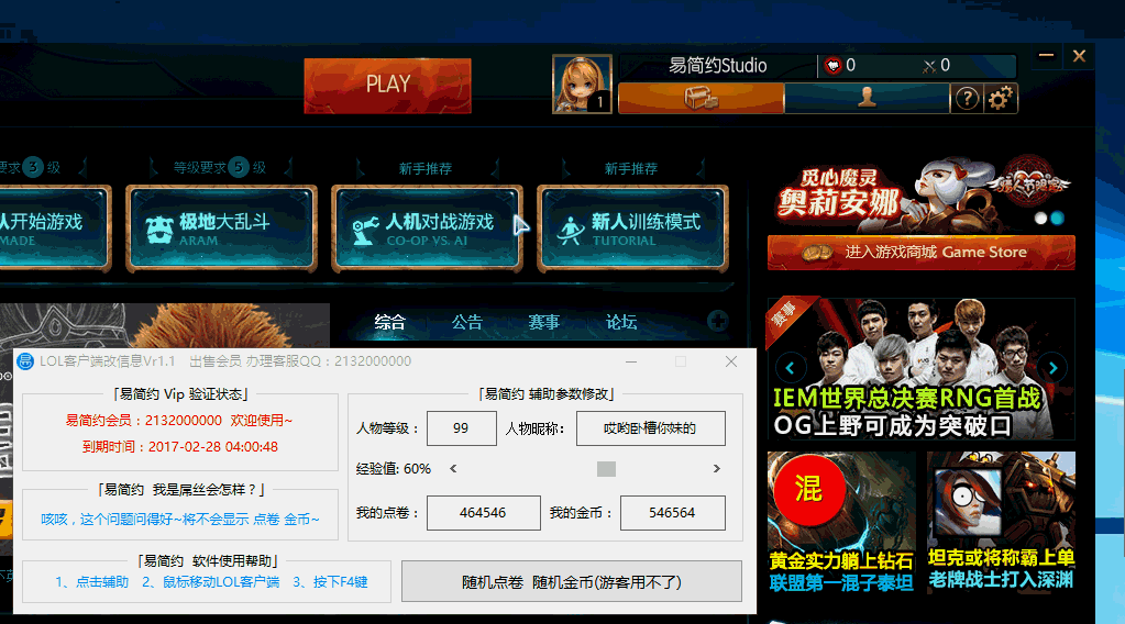 用于修改LOL英雄联盟客户端资料的一款辅助。