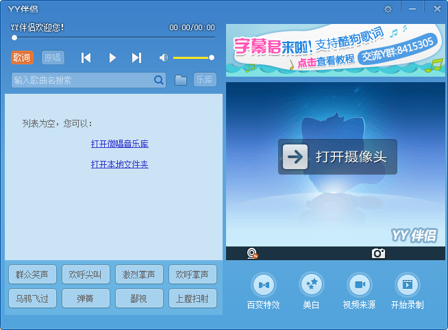 YY伴侣是最专业、最好用的虚拟视频软件,K歌软件,丰富的视频美化功能,让你的视频更加美丽动人,海量的歌曲伴奏库,满足你的K歌需求。