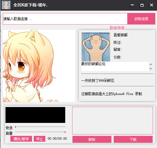 其实大家都非常喜欢全民k歌平台里面的歌曲。可惜总是无法正常下载。但现在有了骚年全民k歌下载歌曲工具,就能够直接解析出歌曲的真实地址,从而让你们可以有效的进行下载!