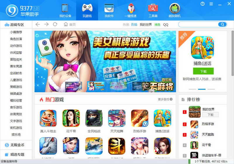 9377苹果助手是一款苹果设备的第三方管理工具,轻松管理软件、音乐、相片、视频文件,全面掌控手机状态,更有海量免费正版应用供您下载,不越狱,也能玩个爽!9377苹果助手免费装海量越狱正版应用,免账号、去广告、不闪退,是果粉必备之作,还可以一键提速让你手机回归裸奔时代。