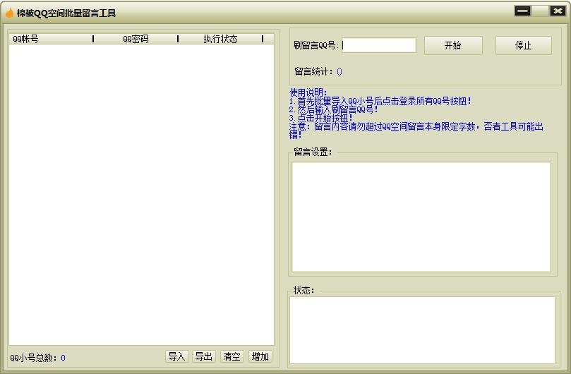 棉被QQ空间批量留言工具是一款由棉被工作室推出的最新空间刷留言软件,这款软件不仅非常专业,而且使用完全免费,支持批量小号无限刷QQ空间留言!软件操作简单,下面是具体的操作步骤,想让你的空间人气暴增吗?那就来试试这款棉被QQ空间批量留言工具吧!