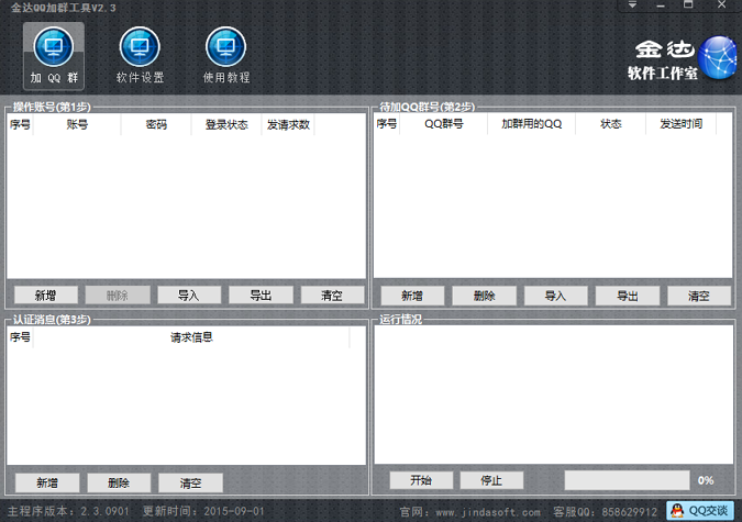 金达QQ加群工具是一款通过QQ客户端模拟手工加群的软件,软件支持批量导入操作QQ账号和要加的目标QQ群,金达QQ群号采集器可以根据关键字采集,非常方便好用,欢迎有需要的朋友免费下载使用!