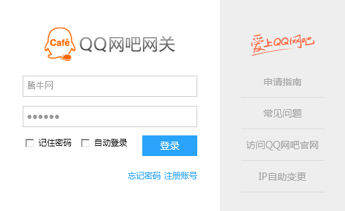 请查阅注册时收到的提示邮件,邮件里有网关帐号、密码等信息,如忘记密码,可在登录框右侧选择“重设密码”进行修改,或直接打开此页面修改:http://netbar.qq.com/gateway/pw_back.htm