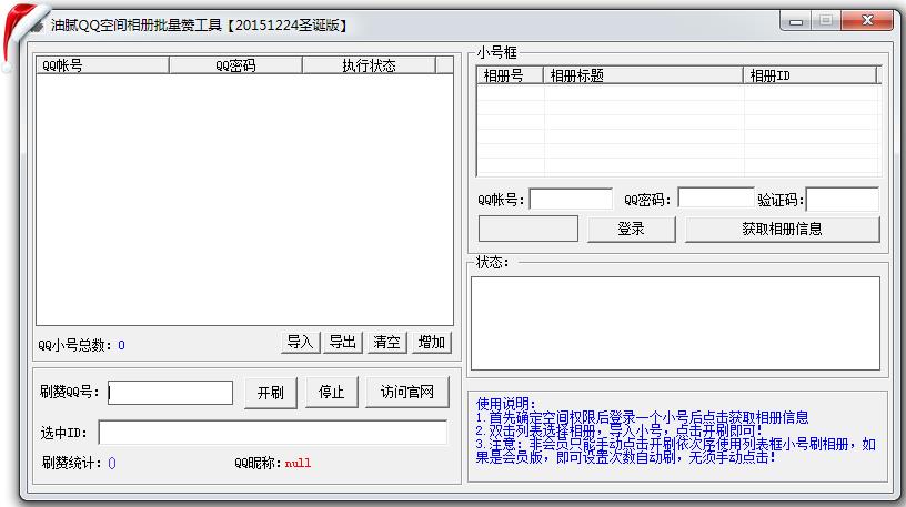 油腻QQ空间相册批量刷赞工具,可以通过是小号批量对QQ空间相册本身批量刷赞,软件使用起来非常简单,首先确定空间权限后登录一个小号,然后点击获取相册信息,双击列表选择相册,导入小号,点击开刷即可!需要的朋友快来试试这个相册批量刷赞软件吧!